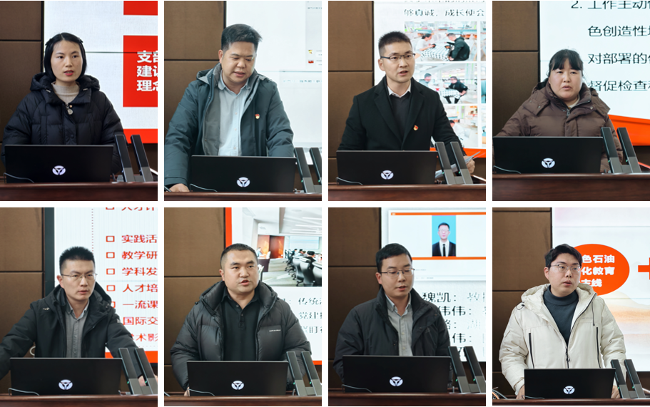 全国党建工作样板支部、油气田开发工程系教工党支部书记许文俊展示了校外党建联建共创活动、“三位一体”党团共建机制和“三全育人”实践成果;油气储运工程系教工党支部书记边江详细介绍了支部“我为师生办实事”实践活动开展过程和成果,切实将党建成果切实转化为育人实效;油气井工程系师生联合党支部书记余义兵汇报了支部标准化规范化建设以及支部党建引领系所教学创新和科学研究情况;机关教工党支部书记杨小玉重点汇报了“党员示范岗”品牌活动开展实效,以及机关党建与“学院目标考核管理办法”等业务工作融合特色。油气田化学工程系教工党支部书记孙珊珊、海工系和实验中心联合教工党支部书记徐鹏、新能源科学与工程系教工党支部书记汪维伟、学生党支部书记代表韩清越分别围绕支部政治建设、组织建设、党员教育管理、服务师生群众、推动中心工作融合等核心职责进行了汇报。