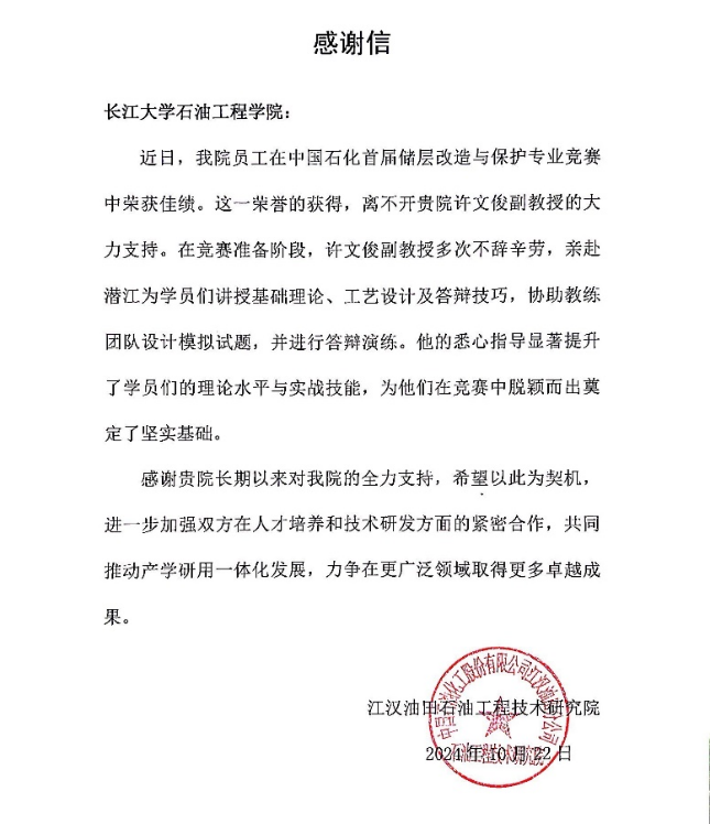 近日,中国石油化工股份有限公司江汉油田石油工程技术研究院向我院发来感谢信,感谢我院许文俊副教授协助江汉油田石油工程技术研究院员工在中国石化首届储层改造与保护专业竞赛中荣获佳绩。
