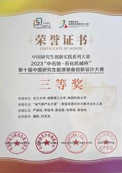 (通讯员 陈金建)9月15至17日,“中石协·石化机械杯”第十届中国研究生能源装备创新设计大赛全国总决赛在中国石油大学(华东)圆满落下帷幕。我院魏凯、刘玉龙老师指导的《“油气增产水之道”一新型自激式水力脉冲注水工具》项目获全国三等奖。