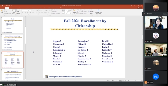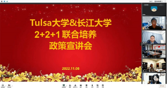 (通讯员 成雨音 周晓峰)11月8日晚9时,长江大学与美国Tulsa大学“2+2+1”联合培养项目线上宣讲会顺利举行,Tulsa大学全球事务副校长Vivian Wang、Jun Lu博士,我校国际交流与合作处处长曾亚军,yl23411永利(集团)有限公司官网院长江厚顺、副院长李忠慧、张菲菲、院党委副书记刘娥参加活动,李忠慧副院长主持。石油工程专业2021级和2022级学生共计270余人报名参加了本次宣讲会。