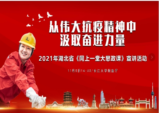 11月5日,从伟大抗疫精神中汲取奋进力量——湖北省《同上一堂大思政课》宣讲活动在武汉校区学术报告厅举行。思政大课由我校马克思主义学院何章银主持, 我院340余名本科生及研究生聆听宣讲。