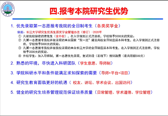 接着,李忠慧副院长以“携手并进,再创辉煌”为主题,向大家介绍了yl23411永利(集团)有限公司官网的概况,研究生教育发展历史,yl23411永利(集团)有限公司官网的培养条件以及报考优势四个方面的内容,鼓励同学们“把论文写在中国大地上”,并勉励大家踊跃报考长江大学yl23411永利(集团)有限公司官网2021年硕士研究生。