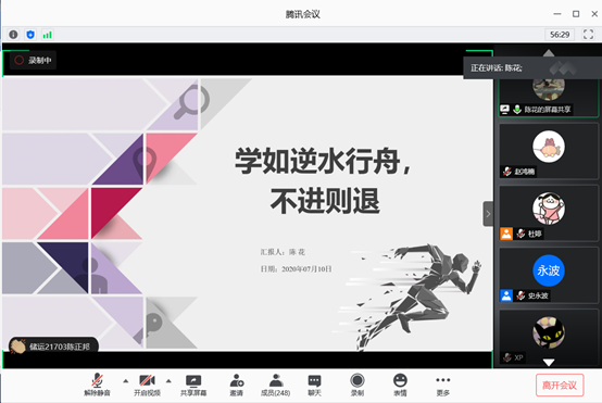2020届优秀毕业生陈花发表了题为“学如逆水行舟,不进则退”的主题演讲,与老师、同学们分享了她的学习心得、就业去向,及选择长大的原因与心路历程。并以短视频的方式介绍了自己在学院的帮助下赴加拿大短期留学的过程,最后,陈花为参加夏令营的同学送上了自己的祝福“祝同学们学有所成,前程似锦!”