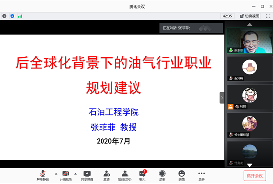 接下来是张菲菲教授以“后全球化背景下的油气行业职业规划建议”为主题向大家讲解了目前石油行业的前景以及未来发展形式,张菲菲的讲解幽默风趣,用事实告诉同学们,“石油不是夕阳产业,相反,行业前景一片光明,但你必须有独当一面的能力,研究方向和导师比学校排名更重要,尊重内心,选你所爱,然后爱你所选。”