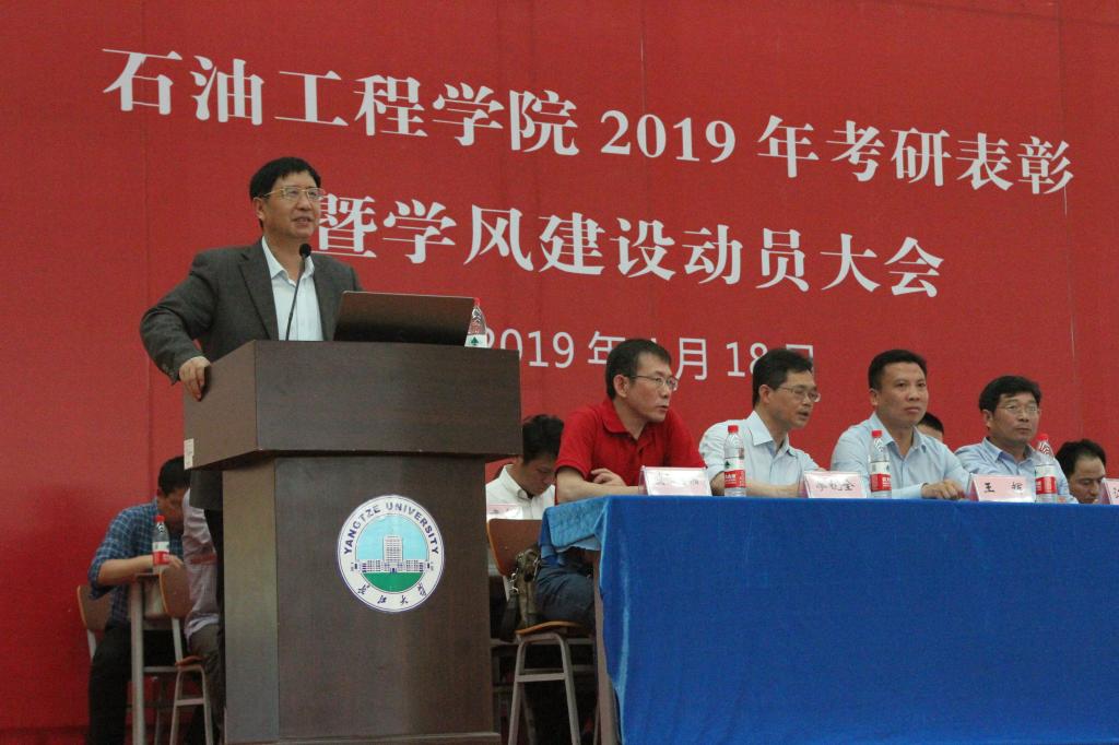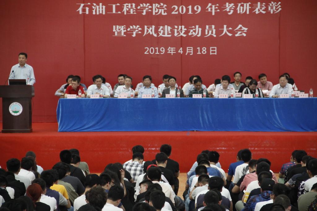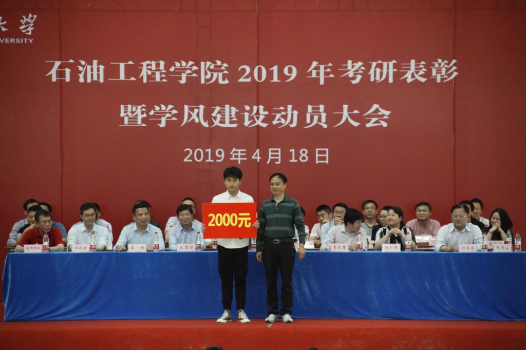 大会在激昂雄壮的国歌声中拉开帷幕。首先由副院长李忠慧老师宣读yl23411永利(集团)有限公司官网2019年考研表彰文件。在2019年全国研究生入学考试与复试中,有108名学生顺利通过初试和复试,被长江大学等18所学校或科研院所录取,其中石油之光21501班录取率为62%,华林公寓2#220和校内女寝4#547两个寝室更是取得“全员高中”的好成绩。随后,10位考研优秀学生代表和15位考研先进集体学生代表依次上台接受表彰并与颁奖领导合影留念。考研优秀学生代表、石油之光21501班朱清源(384分考取中国石油大学(北京))和储运21503班李伯英(354分考取长江大学)分享了他们大学学习生活经历和复习备考经验。