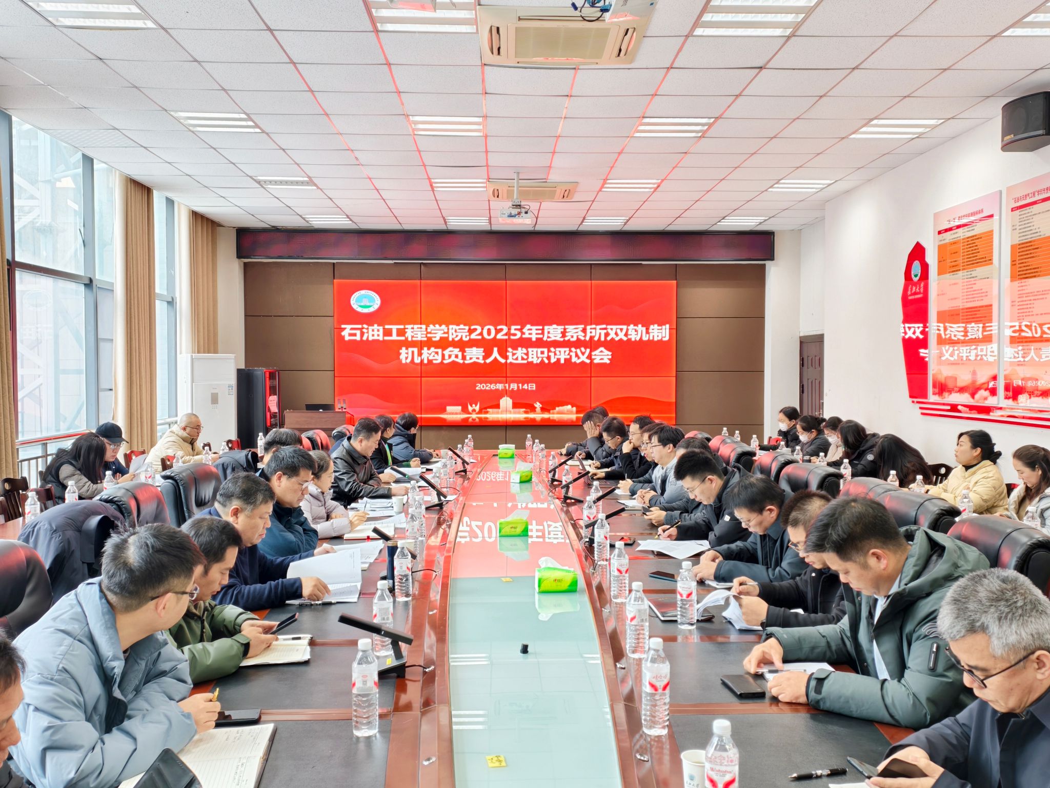 为全面检阅教学研究和科学研究中心年度目标任务完成情况,进一步推进学院机构与机制改革落实落地,1月14日上午,yl23411永利(集团)有限公司官网在石油科技B113会议室,召开2025年度系所双轨制机构负责人述职评议会。院领导,学术委员会,教学委员会、教学运行中心、教学研究中心、科学研究中心、实验中心主任及秘书,各研究所所长、各教学团队负责人、系主任、教工党支部书记、全体行政管理人员等60余人参加会议。