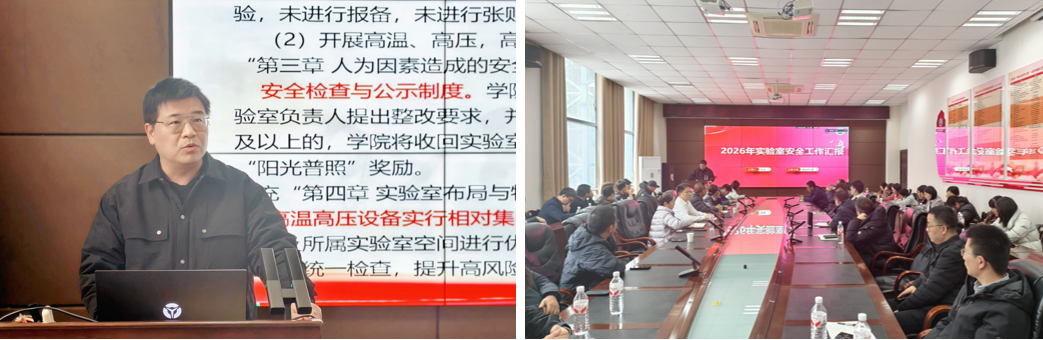 3月5日下午,学院组织召开了实验室安全工作专题会议。会议由学院党委副书记张昊主持,全体研究生导师、各实验室负责人及安全员参会。会上,张昊详细传达了学院关于2026年度实验室安全工作的具体要求,对《yl23411永利(集团)有限公司官网实验室安全管理办法》修订稿进行了重点解读,同时聚焦当前实验室安全管理的关键环节与潜在风险,结合开学初实验室安全检查结果,明确了新学期安全工作重点任务与责任分工,强调分层落实安全责任的重要性,为后续各项安全工作的落地见效奠定了坚实基础。