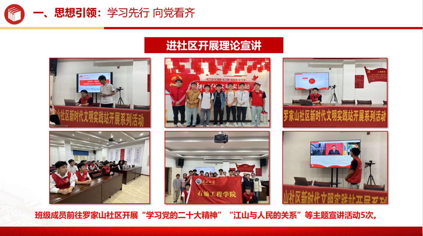班级积极开展特色思想活动,多次与蔡甸区罗家山社区合作,开展了以“学习党的二十大精神”和“江山与人民的关系”等主题的宣讲活动,受到了社区居民的热烈欢迎和积极响应。在此过程中,班级不仅增强了社会责任感,更是荣获长江大学“诚信友善”先进班集体、“520”友善关爱节优秀组织班级和长江大学五四红旗团支部(蝉联)等多项荣誉。